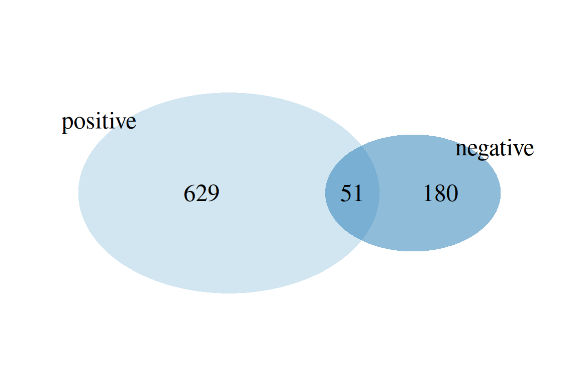 plotVenn(fGroups, aggregate = "set", margin = 0.1) # compare positive/negative features