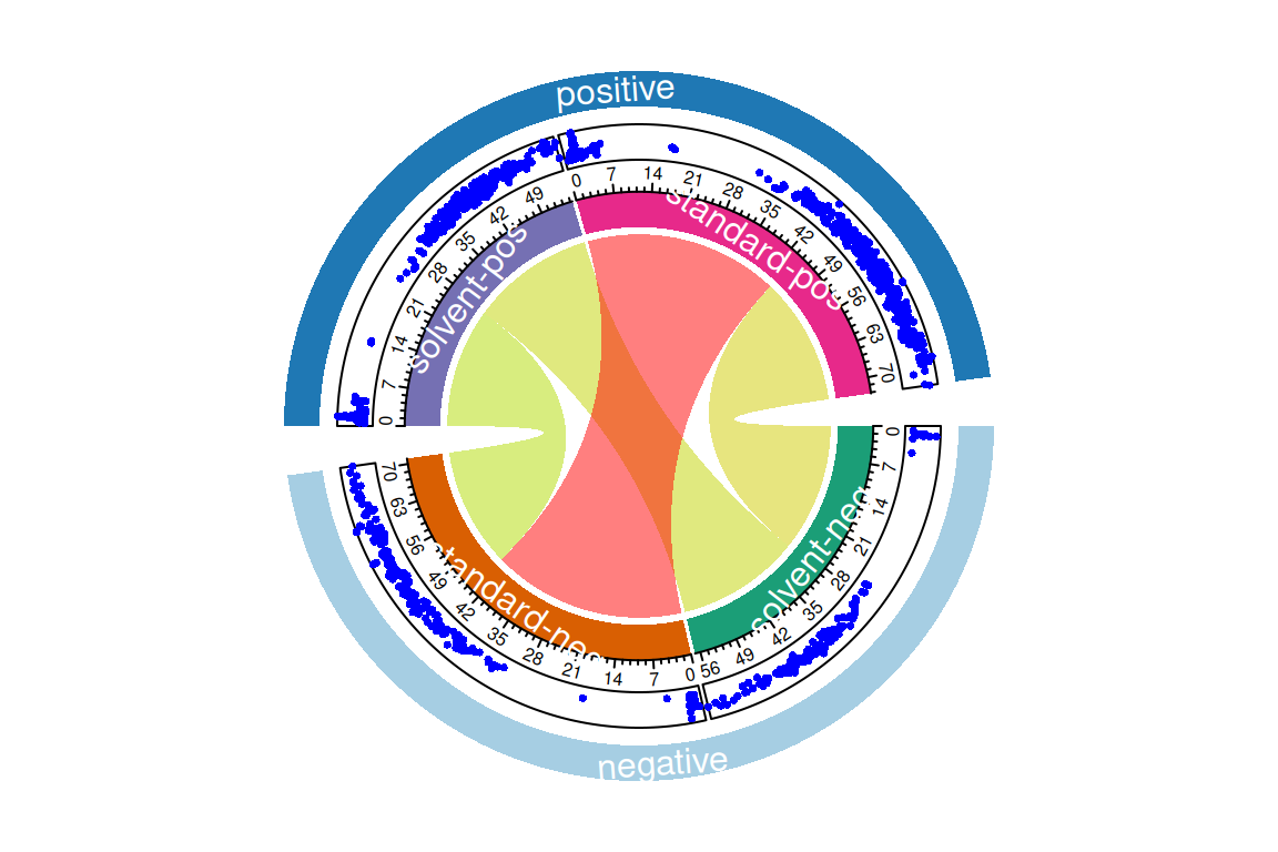 plotChord(fGroups, aggregate = TRUE, groupBy = "set") # compare replicate aggregated positive/negative features
